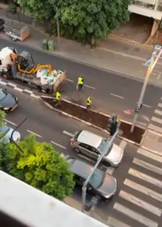 From an elevated view, the video shows road construction in an urban setting