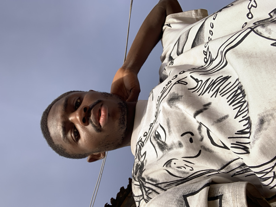 A low-angle shot captures a man with dark skin, a neatly trimmed beard, and a serious expression. He wears a white t-shirt with black abstract designs. His left hand is gently placed behind his head. The background reveals a clear, bright blue sky. In the lower part of the frame, there is a visible part of a roof, implying an outdoor setting. The image is well-lit, highlighting the texture of the man's skin and shirt.