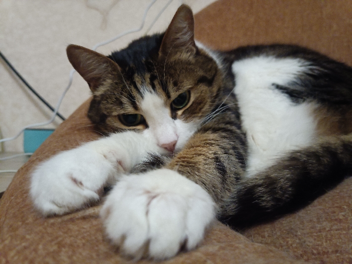 A brown and white tabby cat rests comfortably on a brown surface. The cat's white paws are prominently displayed in the foreground, and its head is slightly turned. Its green eyes are open, but the cat appears relaxed. The background is softly blurred, featuring a teal object and electrical cords.