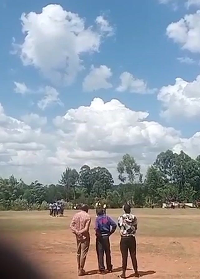 The video depicts an outdoor scene with a clear blue sky filled with fluffy white clouds. The foreground shows a dirt field with short grass, and a group of three individuals standing and facing the field, their backs to the camera. To their left, a team of people wearing red shirts and shorts is seen. In the distance, there is another group of people, appearing to be another team, standing on the field. The backdrop is composed of dense green trees, surrounding the field and creating a natural barrier. The overall atmosphere suggests a sporting event or gathering is taking place.