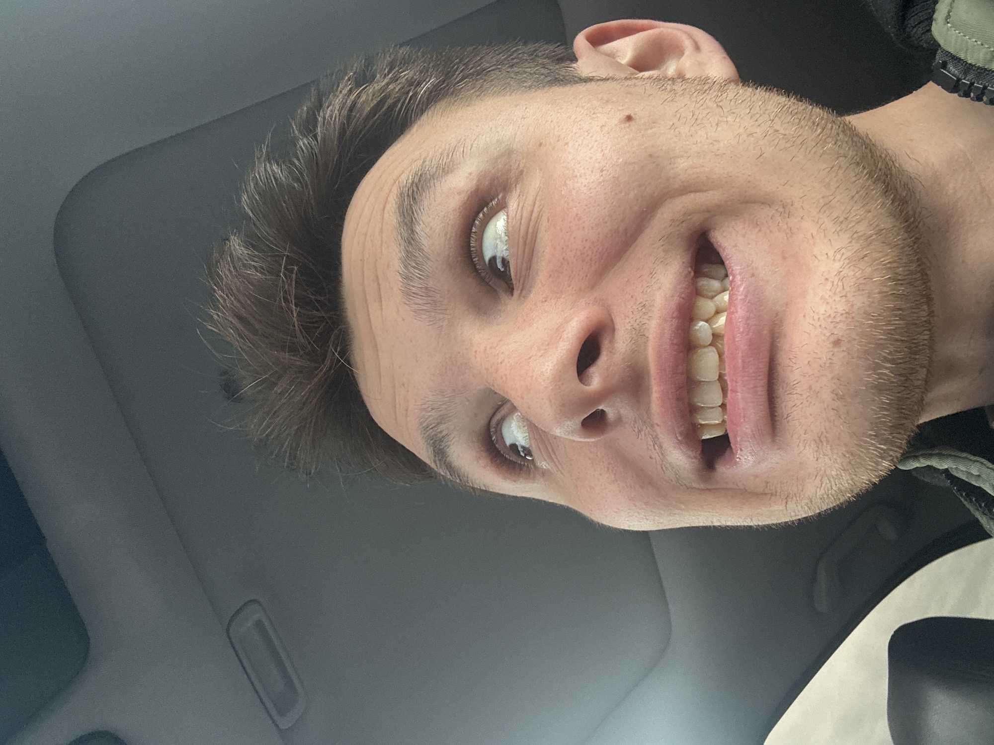 A close-up, angled shot of a Caucasian male with light skin. He has short, dark hair with a slight wave and a light beard. His eyes are wide, and he is smiling with his teeth showing. The background appears to be the interior of a vehicle, specifically the car's ceiling. Location is Unknown, Bulgaria.