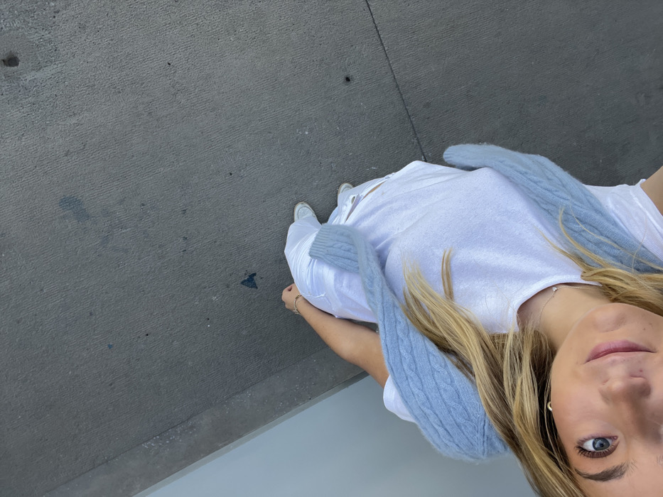 An overhead photograph captures a young adult female looking upwards at the camera with a slight smile. She has long blonde hair and light blue eyes. She is wearing a white short-sleeved t-shirt, white pants, and white low-top sneakers. A light blue cable-knit sweater is draped over her shoulders. Accessories include a delicate silver-colored necklace with a single pendant, small hoop earrings, and a thin gold-colored bracelet on her right wrist. Her arms are positioned at her sides. She stands on a dark gray concrete surface, which exhibits minor discolored spots, next to a plain light gray wall visible along the right side of the frame. No specific landmarks or distinguishing features are present to identify a precise location within Mexico City, Mexico, or any other city.