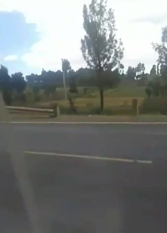 The video, taken from inside a moving vehicle, depicts a landscape of rolling green and brown hills speckled with trees and the occasional building