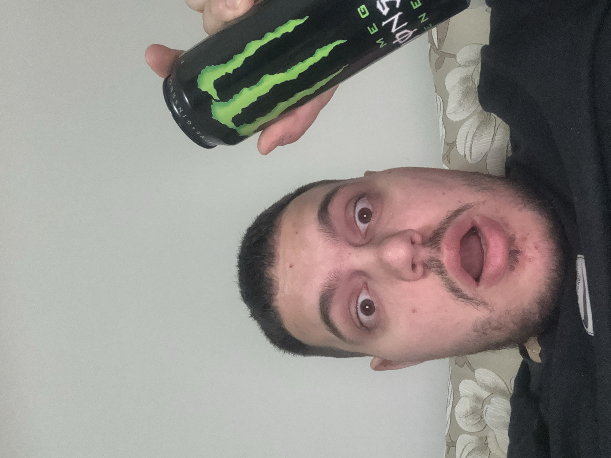 A man with brown hair and a beard is looking directly at the camera with his mouth open. He is holding a can of Monster energy drink above his head. The background is a plain wall and a floral patterned cushion or pillow. There is no indication that this photo was taken in Plovdiv, Bulgaria.