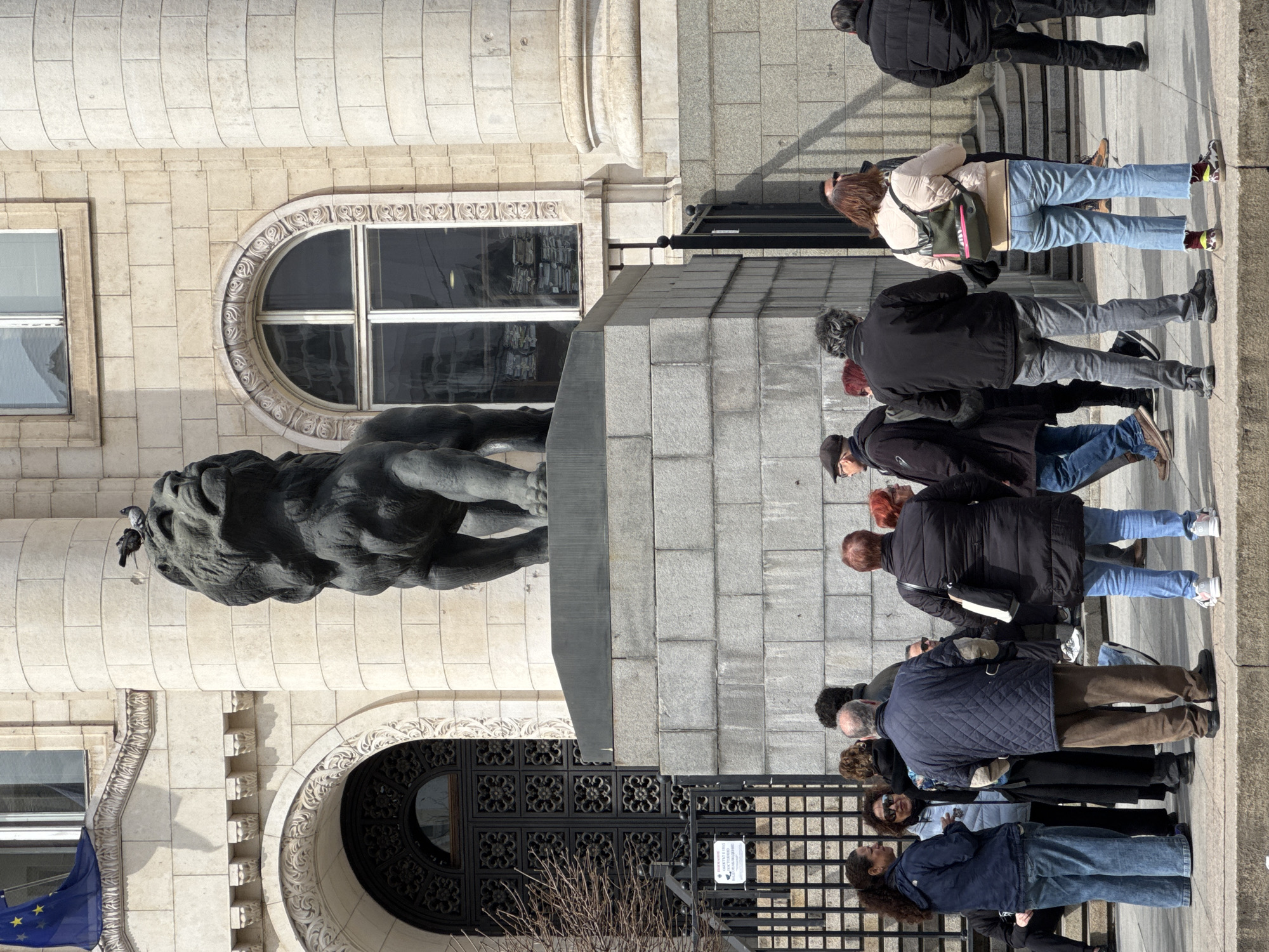 The image depicts an outdoor urban scene in Sofia, Bulgaria, specifically in front of the Palace of Justice. A large, dark-colored lion statue, likely bronze, stands prominently on a multi-tiered light grey stone pedestal in the foreground-midground. The lion is facing right and upwards. Two pigeons are perched on the lion's head. Behind the statue is the monumental Palace of Justice, constructed from light-colored, possibly granite or limestone, blocks. The building features large fluted columns, ornate arched windows with white frames and decorative surrounds, and a grand arched entrance on the left with an intricate dark metal gate. A European Union flag (blue with yellow stars) is visible draped from an upper window on the building's left. Through a window on the right side of the building, stacks of documents or files are visible. A black metal fence with square sections runs in front of the building, leading to the entrance. A white rectangular sign attached to the fence bears Cyrillic text, which states "ВНИМАНИЕ ВИДЕОНАБЛЮДЕНИЕ ОБЕКТЪТ Е ПОД ПОСТОЯННО ВИДЕОНАБЛЮДЕНИЕ" (ATTENTION VIDEO SURVEILLANCE THE OBJECT IS UNDER PERMANENT VIDEO SURVEILLANCE). Bare tree branches are visible near the fence on the left. Approximately 15 to 20 adults are gathered on the paved area in front of the statue and building. They are standing in various small groups, generally facing towards the building or the statue, observing the scene. Individuals are dressed in casual to smart-casual attire, including coats, jackets, jeans, and trousers. The scene is illuminated by bright daylight, casting visible shadows.