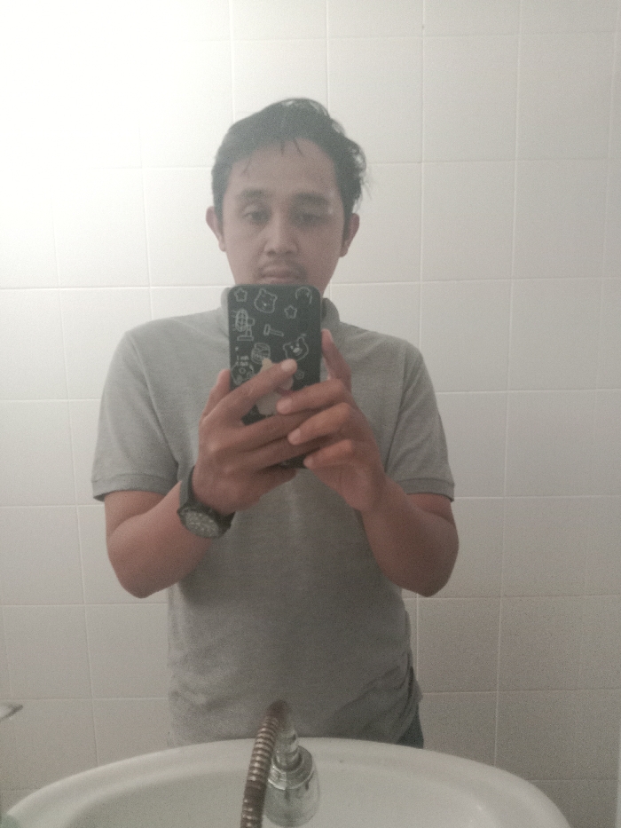 A man takes a selfie in a bathroom with white tiled walls. He wears a gray polo shirt and a dark wristwatch on his left wrist. The phone he is using has a patterned case. A white sink and faucet are visible at the bottom of the frame. The lighting is soft and slightly diffused.