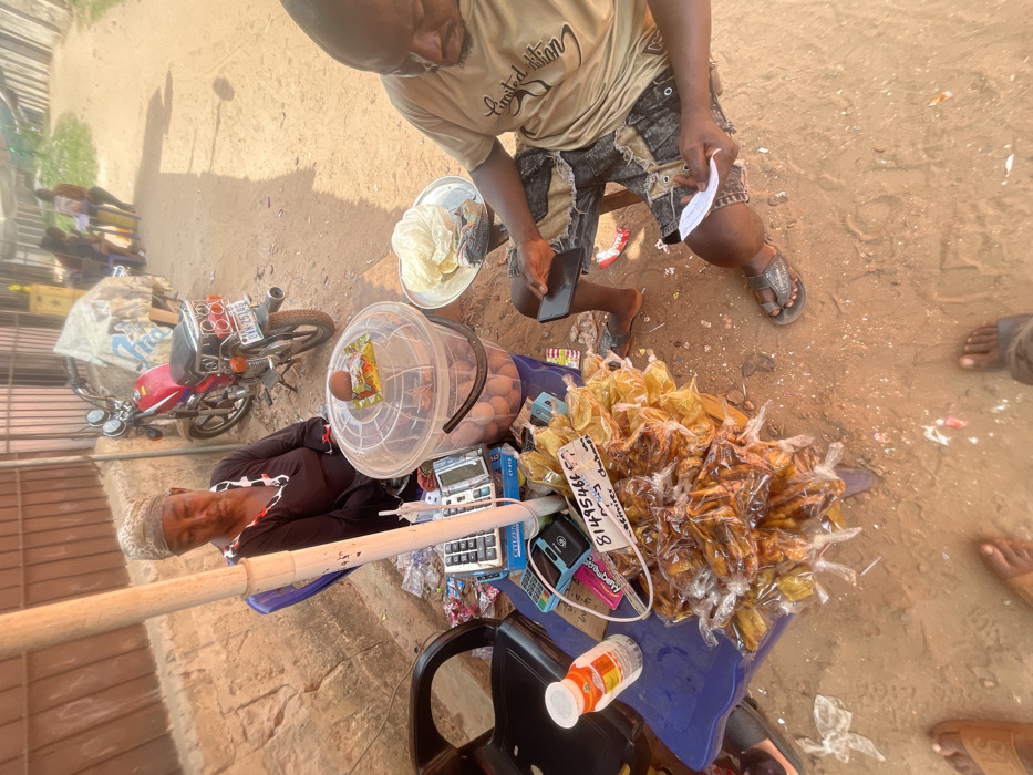 The image depicts an outdoor market stall scene in Uturu, Nigeria, captured from an elevated perspective