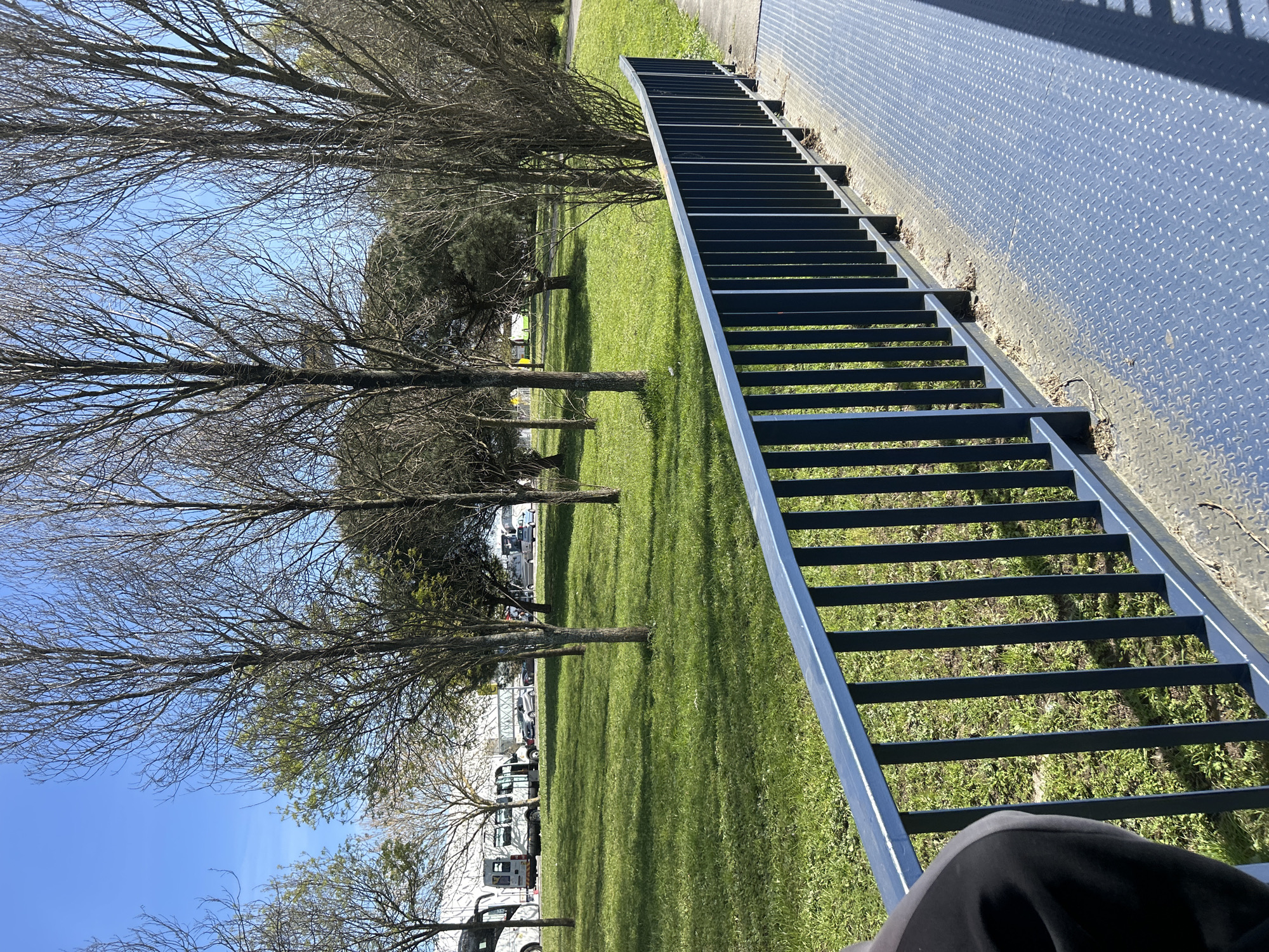 The image depicts an outdoor scene in Matosinhos, Portugal, on a clear, sunny day. In the foreground, a blue-grey metal walkway or bridge extends from the right towards the left, featuring a diamond-plate surface and a parallel railing with vertical balusters. A portion of dark grey and black fabric, consistent with human clothing, is visible on the far left, suggesting the presence of a person. The midground features a large, well-maintained grassy area with vibrant green turf. Scattered across this area are numerous deciduous trees, mostly bare of leaves, indicating late winter or early spring. Some evergreen trees and bushes with visible foliage are also present. Sunlight casts distinct shadows across the grass from the trees and the railing structure. In the background, beyond the grassy area, a paved surface is visible, hosting several vehicles. These include multiple white vans or minibuses, at least one large white bus, and a silver car. A large, light-colored building or industrial structure is discernible behind the vehicles on the left, while denser tree lines appear on the right. The sky overhead is clear and bright blue, with no discernible clouds. No explicit interactions or actions are captured; the scene appears static.