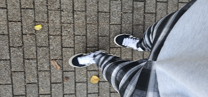 The image displays an overhead perspective of a person walking on a paved outdoor surface in Kamenz - Kamjenc, Germany. The ground is composed of grey, rectangular interlocking pavers. Visible on the paving are two distinct yellow leaves and one brown, dried leaf. The individual is wearing trousers with a black and white plaid pattern and the hem of a light grey garment, possibly a sweatshirt, is visible at the bottom of the frame. On their feet are black athletic shoes with white laces, white soles, and three white stripes on the side. The left foot is positioned slightly in front of the right, indicating forward motion.