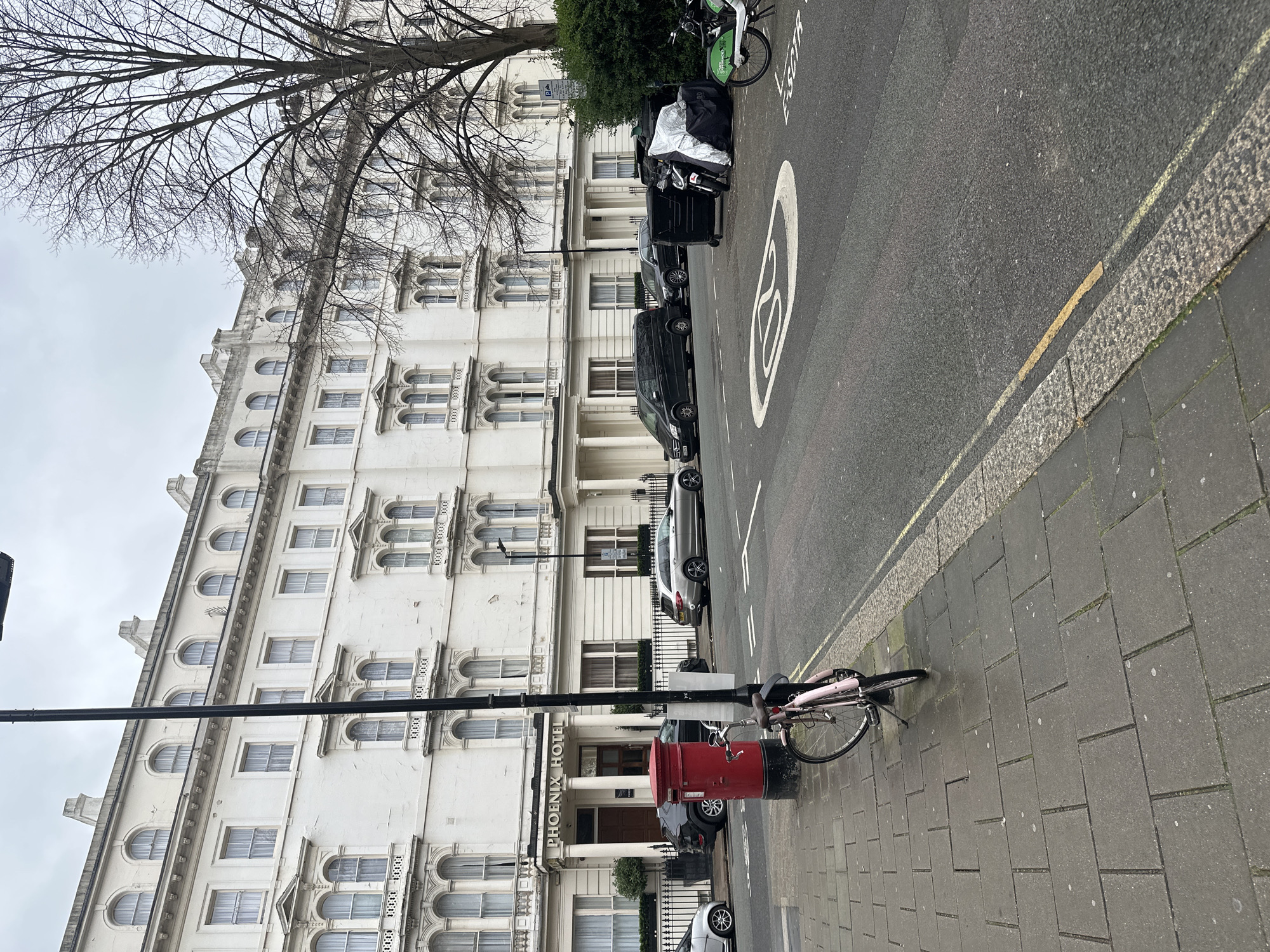 The image depicts a static street scene in front of the Phoenix Hotel, located at 1-8 Leinster Gardens, London W2 3AN, United Kingdom. The central subject is a multi-story, white neoclassical building, identified by a sign reading "PHOENIX HOTEL" above its entrance, which features large columns and arched windows with decorative balconies. In the immediate foreground on the left, a paved sidewalk holds a red cylindrical post box and a pink bicycle leaning against a black lamppost. The asphalt street visible to the right of the sidewalk shows a white "20" speed limit marking and a partial white text marking, "E-SC__". Double yellow lines delineate the street's edge. Vehicles parked along the street include a silver Mercedes-Benz station wagon, a black Mercedes-Benz van, a dark grey SUV partially visible near the hotel entrance, and a small silver hatchback also partially visible. Further down the street on the right, a motorcycle covered by a silver tarp is parked next to a black waste bin and a green "Free Now" share bicycle. A large, leafless deciduous tree stands on the right side of the frame, partially obscuring the hotel facade, alongside a green bush below it. The sky is overcast, and no individuals or dynamic actions are visible.