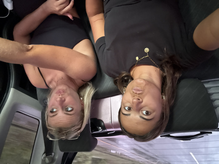 Two adult females are seated in the rear passenger compartment of a vehicle, presumed to be a car or small SUV, operating in Habaraduwa, Sri Lanka. The image is a selfie captured from the perspective of the female positioned on the left. The female on the left has brown hair, brown eyes, and a medium skin tone. She is wearing a black short-sleeved top, multiple gold chain necklaces with various pendants, and gold hoop earrings. Her face is directed slightly upward and to her right, with her lips pursed in a "pouting" expression. Her right arm is visible in the lower left foreground, suggesting it is holding the imaging device. The female on the right has blonde hair, light-colored eyes, and a lighter skin tone. She is wearing a black spaghetti-strap top, a thin gold necklace, gold hoop earrings, and eyeglasses resting on top of her head. Her face is directed slightly upward and to her left, also displaying a "pouting" expression. Her left arm is partially visible in the lower right foreground. The vehicle's interior features black upholstered seats and headrests. The rear window shows a blurred reflection of a road with a visible white dashed line. The ambient lighting suggests low-light conditions, indicative of dusk or night. The external environment viewed through the side windows is indistinct and blurred due to motion or focus.