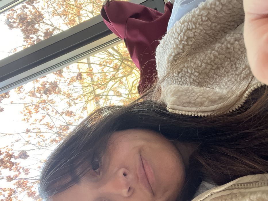 An indoor, eye-level photograph depicts a woman positioned on the left side of the frame. She has long, dark brown hair and a neutral facial expression, with her head angled slightly to the right. She is wearing a light-colored, textured fleece jacket. To the right, a dark-framed window is visible, through which an outdoor scene is apparent. This scene features numerous deciduous trees with sparse, brown-orange foliage, indicative of late autumn or winter, set against a bright sky. A maroon-colored garment is partially visible on the right, resting near the window. The overall environment is consistent with an interior space overlooking an outdoor tree-lined area within the city of Heilbronn, Germany.