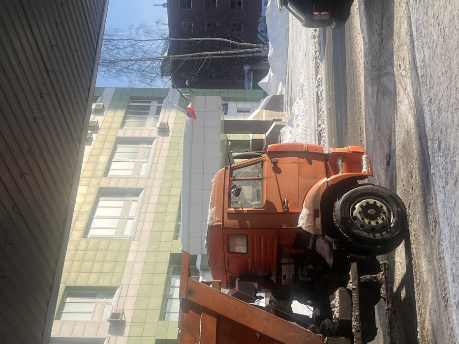 The scene depicts a clear, sunny winter day in Khimki, Russia, observed from beneath a dark, corrugated metal overhang. In the immediate foreground on the left, an orange KAMAZ-style dump truck, partially covered with snow, is parked or stopped on a snow and ice-covered roadway. The truck's cabin, front wheel, and part of its open dump bed are visible. To the far right, a dark-colored vehicle, likely an SUV, is partially visible, also on the snowy surface. In the midground, a multi-story building with a facade featuring alternating horizontal bands of light green and off-white panels is prominent. Numerous rectangular windows are visible, along with external air conditioning units mounted beneath some windows. A white, multi-tiered canopy extends over an entrance to this building, and a small Russian flag (white, blue, red horizontal stripes) is affixed to the underside of this canopy, hanging vertically. This building is identified as the Administration of the City District of Khimki, located at Prospekt Mira, 23. To the right of this administrative building, a darker, possibly brick, building is partially visible in the background, obscured by several bare deciduous trees (likely birches). Snowdrifts are present along the edges of the cleared roadway and around the base of the buildings. The sky above is clear and blue, and bright sunlight casts distinct shadows. No people are visible in the scene, and no explicit actions or interactions are taking place.