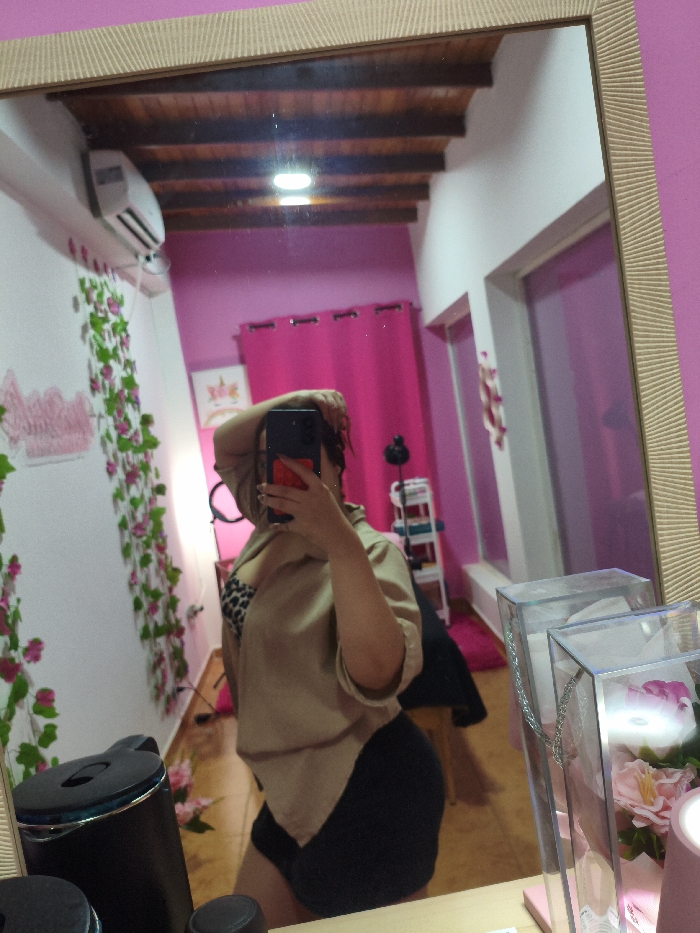 The image displays a mirror selfie taken indoors in Juan Griego, Venezuela. A single individual is reflected, with their face obscured by a dark-colored smartphone encased in a red cover, which they hold to capture the image. The person wears a light-colored, possibly tan or beige, collared shirt unbuttoned over a leopard-print top, paired with black shorts. One arm is raised, with the hand positioned near the head. The reflection reveals a room with bright pink walls and matching curtains covering an opening. A contrasting white wall features a decorative vertical vine with green leaves and pink flowers, along with stylized pink text or a logo. A white wall-mounted air conditioning unit is visible near the white ceiling, which is characterized by exposed dark wooden beams and a recessed light fixture. In the background, a white multi-tiered shelving unit, a black object resembling a salon chair, and a light-colored stand with a ring light are present. The floor appears to be light-colored wood, partially covered by a small pink rug. In the lower right foreground, multiple clear rectangular display cases are visible, one containing artificial pink flowers and a white element. A black container or kettle-like object is visible in the lower left foreground.