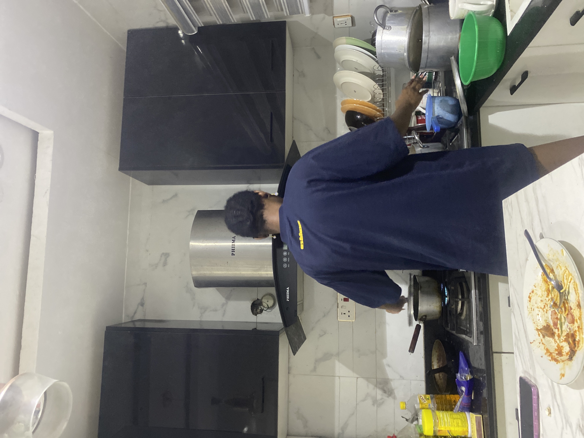 An individual wearing a dark blue garment stands in a kitchen. The kitchen has black cabinets, marble-patterned walls, and stainless steel appliances, including a range hood labeled "PHIMA" over a gas stovetop. The stovetop has pots and pans on it. The individual appears to be cooking or cleaning. To the right of the stovetop, on a marble countertop, there's a dirty white plate with leftover food, a fork, and a mobile phone. Below the stovetop, there are assorted bottles and containers. A dish rack containing plates and bowls is visible above. The image does not give enough information to determine a specific location in Lagos, Nigeria.