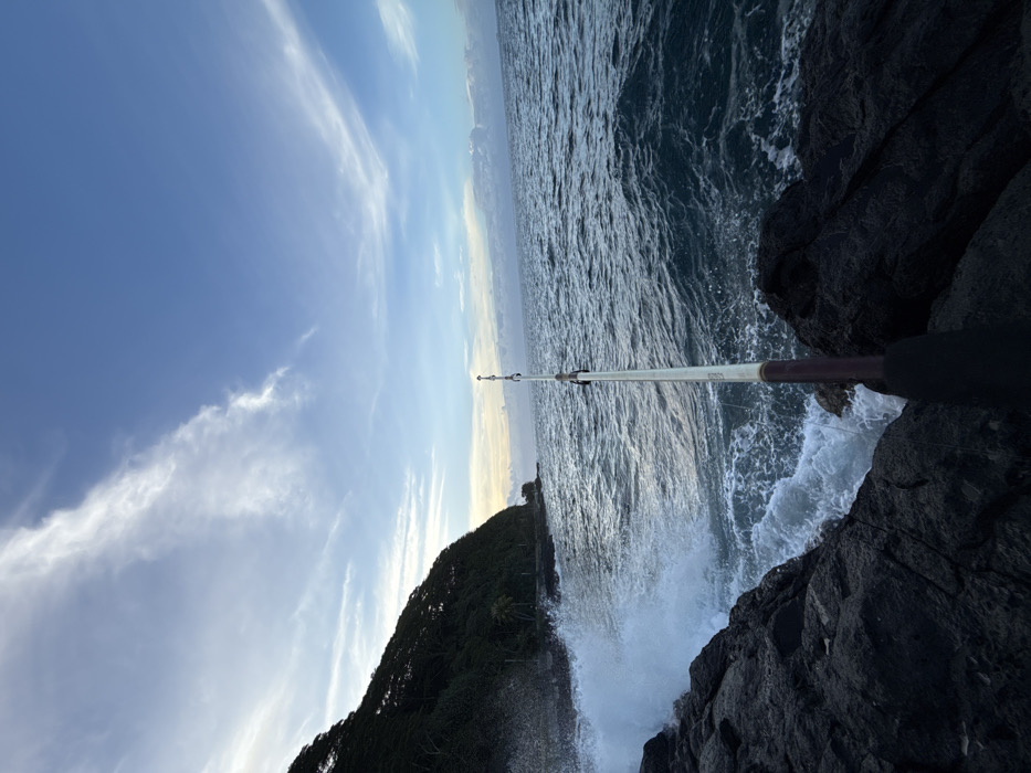 The image captures a coastal rock fishing scene in Hitiaʻa ʻo te Rā, France. In the immediate foreground, dark, rugged volcanic rock formations are visible. A light-colored fishing rod with a dark handle extends diagonally from the lower center-right, with its line cast into the turbulent, deep blue-green ocean water. To the left, large waves forcefully crash against the rocks, generating prominent white spray and foam. Further left, a steep hillside densely covered with dark green vegetation rises sharply from the water's edge; a narrow, dark strip at its base suggests a coastal road or path. The ocean dominates the midground and background to the right, extending to a horizon where faint landmasses or low-lying clouds are discernible. The sky is partly cloudy, transitioning from a lighter blue near the horizon to a deeper blue overhead, with several elongated white clouds present. The lighting conditions suggest either early morning or late afternoon. No individuals are visible in the scene.