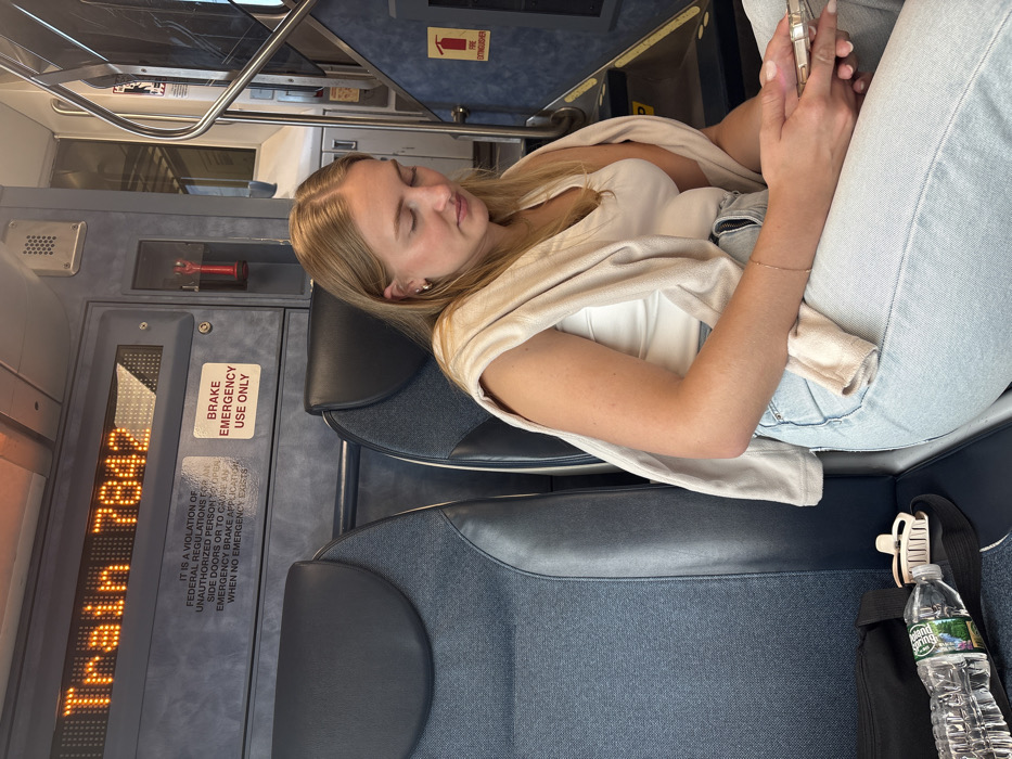 The scene depicts the interior of a train, located in Harrison, United States. A young adult female is seated on the right side of the frame, looking down at a light-colored smartphone held in both hands. She has blonde hair, a fair complexion, and wears a white tank top, light blue denim jeans, and a light-colored sweater draped over her shoulders. Small hoop earrings are visible, and a thin chain bracelet is on her right wrist. To her immediate left, on an adjacent seat, rests a clear Poland Spring water bottle, a black bag, and a light-colored hair claw clip. The train's interior features blue and grey upholstered seats. Above the seating, a digital display panel reads "Train 7842" in orange characters. Below the display, a white sign with black text warns: "IT IS A VIOLATION OF FEDERAL REGULATIONS FOR AN UNAUTHORIZED PERSON TO OPEN SIDE DOORS OR TO CAUSE AN EMERGENCY BRAKE APPLICATION WHEN NO EMERGENCY EXISTS." An adjacent red-bordered sign states "BRAKE EMERGENCY USE ONLY." A red emergency handle or device is mounted on the wall to the right of these signs. Towards the rear right, steps indicate another section of the train, and a red fire extinguisher symbol is visible on a lower wall panel.