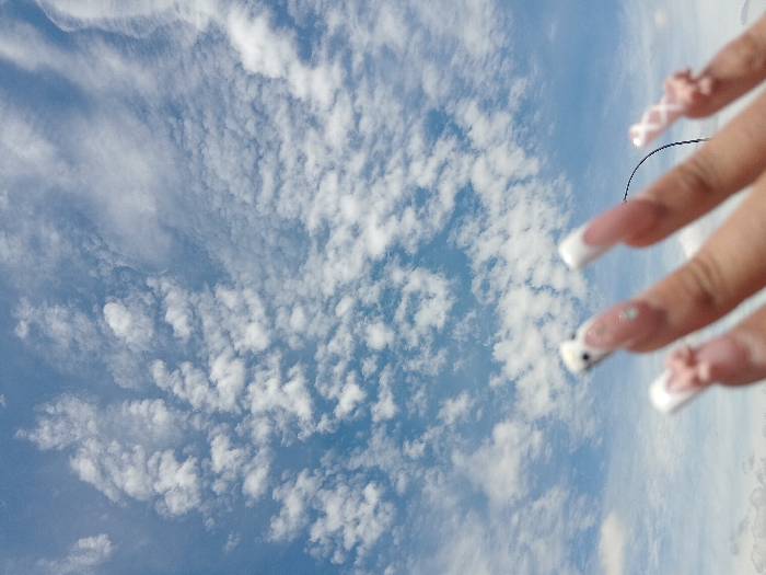 A human hand is prominently featured in the blurred foreground of an upward-angled outdoor photograph, set against a vast blue sky filled with numerous scattered white clouds. The image was captured in Germiston, South Africa. The hand displays long, manicured nails with white French tips. Specific adornments include a light pink 3D bow on the thumb and index finger nails, a small clear gemstone and a white 3D embellishment on the middle finger nail, and a light pink 3D criss-cross pattern and bow on the pinky finger nail. A slender, dark, curved object is faintly visible in the blurred mid-background between the ring and pinky fingers. The sky exhibits varying patterns of cumulus or stratocumulus clouds under bright daylight conditions.