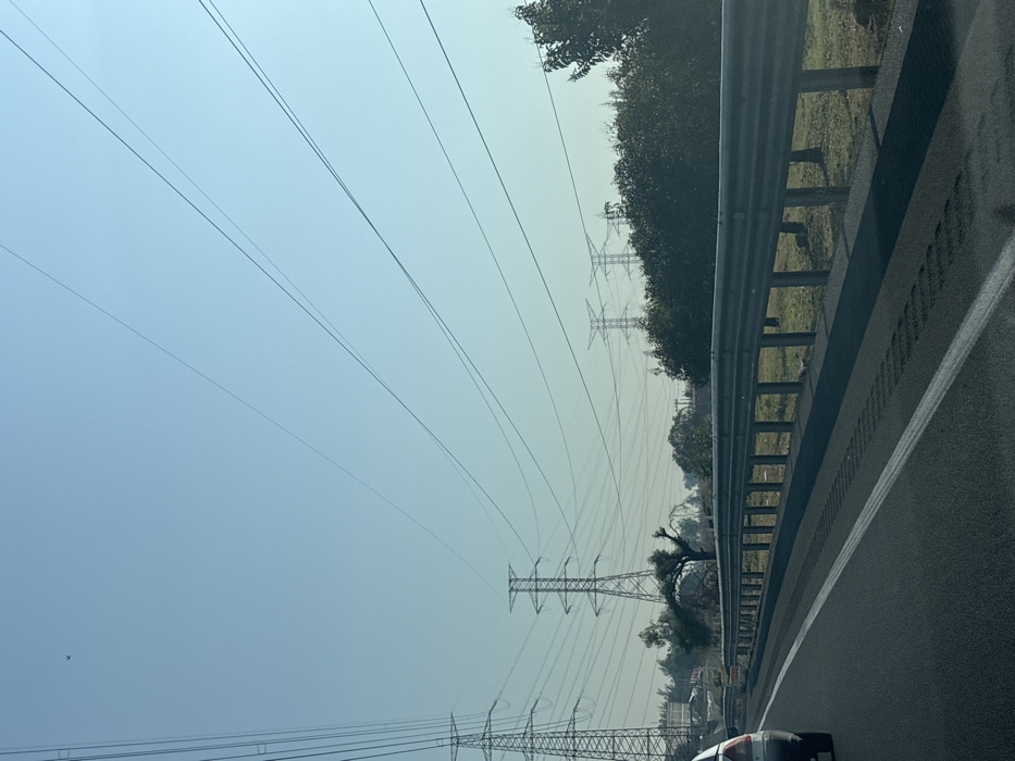 The scene depicts an outdoor highway environment in Cuautitlán Izcalli, Mexico, viewed from a vehicle traveling forward. The sky is clear and light blue, with a small, dark, indistinct aerial object visible in the upper left quadrant. The foreground shows an asphalt road surface with a solid white line on the left and tire track patterns visible on the dark pavement. A partial view of a light-colored vehicle's rear driver's side is present on the far left, suggesting the camera's perspective is from a trailing or parallel vehicle. To the right of the roadway, a galvanized metal guardrail with vertical posts runs horizontally across the frame. Behind the guardrail, a strip of sparse vegetation transitions into denser green shrubbery and trees. A distinctive, gnarled tree with a pronounced bend in its trunk is visible behind the left portion of the guardrail. In the midground and background, multiple large metal lattice-type electrical transmission towers are prominent. At least five such towers are visible, carrying numerous overhead power lines that crisscross the sky from left to right. The distant landscape appears somewhat hazy, with further indistinct vegetation and structures on the horizon. There are no identifiable human subjects or direct human actions depicted.