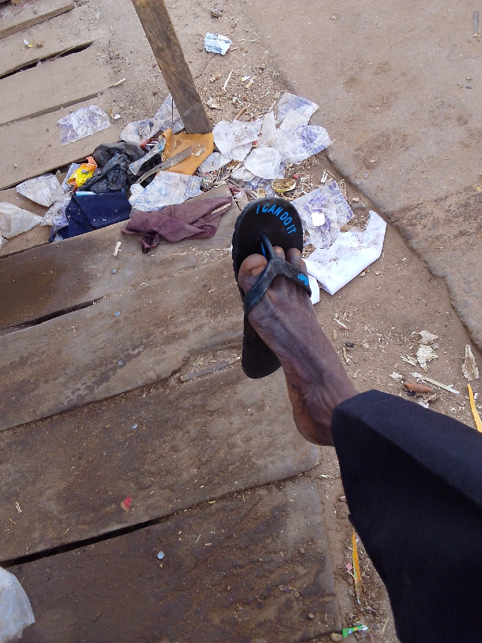 This overhead forensic image depicts a dark-skinned right foot, partially clad in a dark-colored garment, wearing a black flip-flop inscribed with blue text "I CAN DO IT". The scene is located in Zaria, Nigeria. The foot is positioned above a ground surface composed of two distinct sections: weathered wooden planks secured by visible nails on the left, forming a walkway, and dry, light brown unpaved earth on the right. A significant accumulation of refuse is centrally located where these two surfaces meet. This debris includes numerous clear and white plastic sachets, dark and reddish-brown fabric scraps, an orange fabric piece, wood splinters, a yellow fruit peel, and a metal blade approximately 15-20 cm in length resting on the orange fabric. A rough wooden pole extends diagonally from this debris pile towards the upper left.