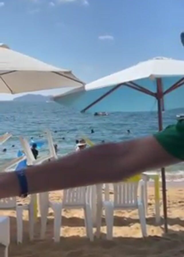beach scene on a sunny day. Several white umbrellas are visible, shading white tables and chairs set up on the sand. The sea is in the background with people swimming and floating. A person's arm is in the foreground, partially obscuring the view. There are other people walking along the beach.