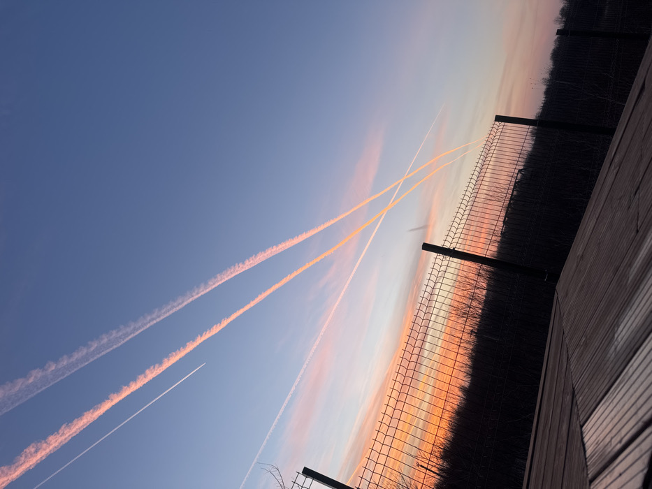 The image displays an outdoor scene at sunset or sunrise, situated in Căciulați, Romania. The sky occupies the majority of the frame, exhibiting a gradient from vibrant orange and pink hues near the horizon to a pale blue overhead. Multiple aircraft contrails are visible; three prominent, orange-tinted contrails intersect, forming an 'X' shape, while thinner white contrails are also present. A small, white aircraft is discernible within one of the upper left contrails. In the foreground, a light brown wooden deck or platform is visible on the lower left, constructed from parallel planks. Extending across the mid-ground is a dark, metal mesh fence supported by vertical posts, creating a visual barrier. Beyond the fence, the landscape consists of a dark silhouette of trees and dense vegetation against the colorful sky, indicating an undeveloped or natural area. No people or specific interactions are observed.