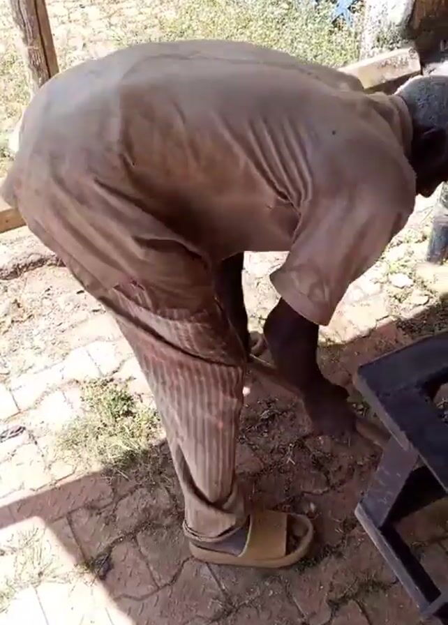 An elderly man bends over a metal frame on a paved surface. He wears light-colored clothing, and sandals. He appears to be working on the frame. Blue fencing is visible in the background.