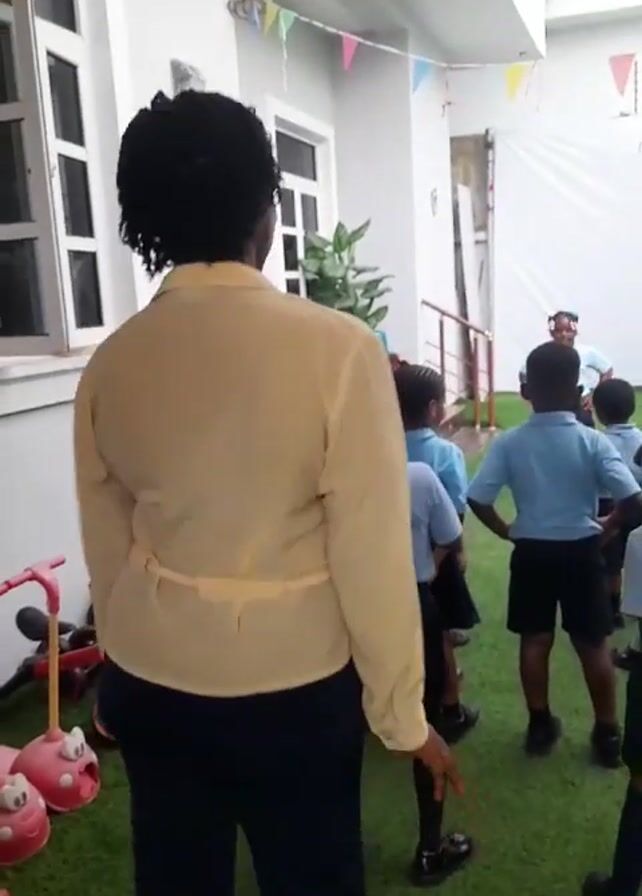 A group of children stand facing an adult at the far side of an outdoor area. The children are wearing light blue shirts and dark shorts and shoes. The adult is wearing a light-colored shirt, light-colored pants, and a dark visor. A woman with short dark curly hair, wearing a light yellow collared shirt and dark pants, stands facing the group. To the left of the woman are children’s riding toys. The area where the children are standing has artificial turf. There is white signage at the far side of the group. There are buildings surrounding the area.