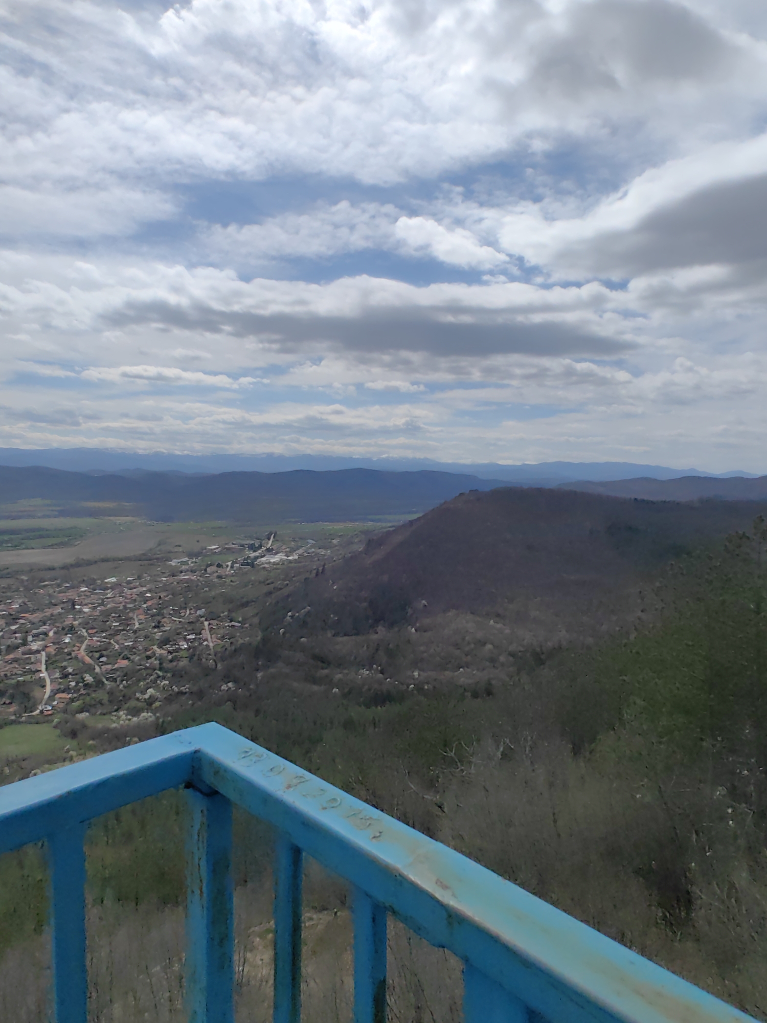 The image depicts a landscape scene from what appears to be an elevated viewpoint, likely a lookout tower or similar structure, as indicated by the blue metal railing in the foreground. **Location:** This scene is likely Vrabevo, Bulgaria. **Environment:** The background shows a panoramic view of hills, mountains, and a village. The sky is partially cloudy with white and gray clouds interspersed with patches of blue. The landscape consists of a valley and hills covered with sparse vegetation, potentially a mix of trees and shrubbery. In the distance, a mountain range is visible. **Objects:** The main object is a blue metal railing.