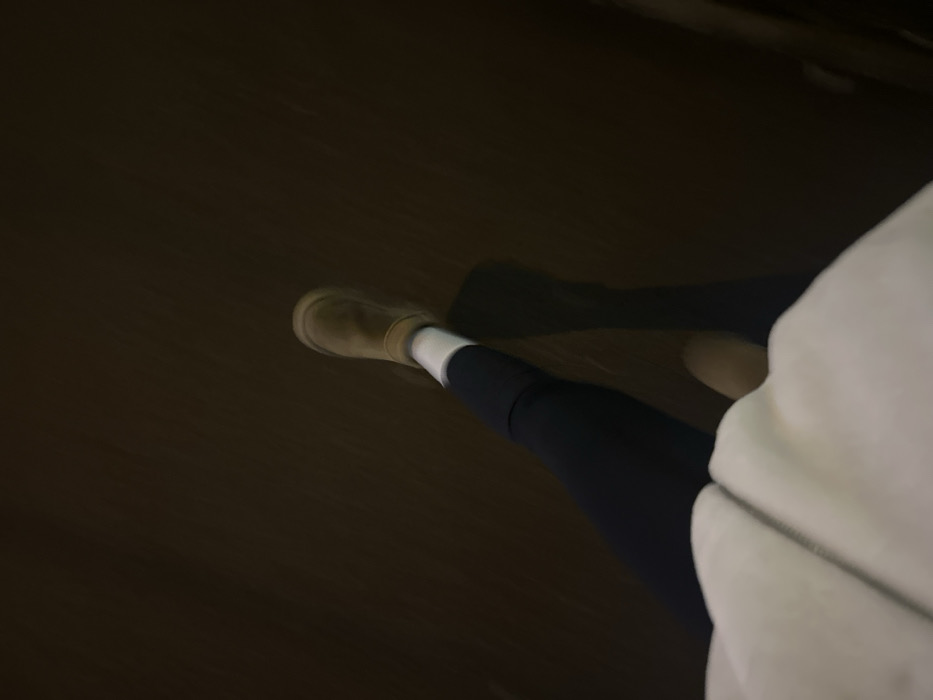 A slightly blurred first-person perspective captures the lower body of a person in motion. They wear dark leggings, white socks, and light brown Ugg-style boots. A white hoodie with a visible zipper is also in view. The background is a dark, undefined surface, likely a road or path, with motion blur suggesting movement. The lighting is dim, contributing to the overall soft focus of the image.