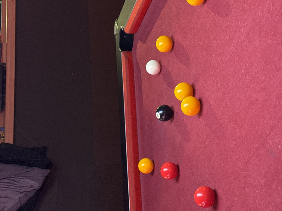 The scene is depicted in Reichstett, France. The image presents an angled view of a red-felted pool table. Ten pool balls are situated on the felt surface: one white cue ball, one black 8-ball, three solid red balls, and five solid yellow-orange balls. The balls are distributed across the visible portion of the table. A red wooden rail borders the table's edge, and a dark metal corner bracket, associated with a pocket, is visible on the upper right side. The background directly behind the table is dark and indistinct. A dark, folded garment is partially visible in the upper left background, and a narrow wooden shelf extends horizontally across the top edge of the frame. No individuals are present, and no actions are occurring within the depicted scene.