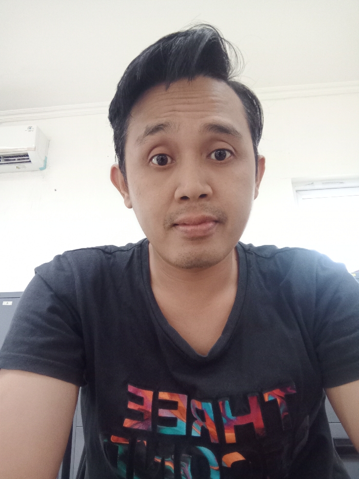 A man with styled black hair and a black t-shirt faces the camera. His expression is neutral, with wide eyes. An air conditioning unit is visible on the wall behind him. The t-shirt has the word "THREE" printed on it in a colorful, stylized font. A filing cabinet is partly visible in the bottom left. The background is plain and white, with natural light coming in from a window to the right.
