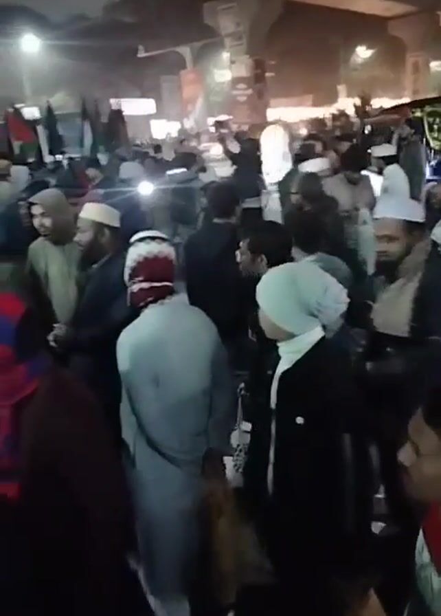 large group of people gathered in what appears to be an outdoor urban setting. Many individuals are wearing traditional Muslim attire, including skullcaps, and some are carrying flags. The crowd is densely packed, and the individuals appear to be engaged in a demonstration or procession. The environment is lit by streetlights, and an elevated structure, possibly a bridge or overpass, is visible overhead.