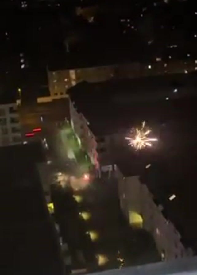 nighttime cityscape with fireworks. The fireworks explode at a lower altitude than the distant city skyline, appearing closer to the buildings in the immediate foreground. The camera shakes during the explosions. The fireworks are a mix of colors, including orange, yellow, and red. The immediate surroundings appear to be buildings with some visible lighting. The video appears to be taken from a balcony or elevated position.