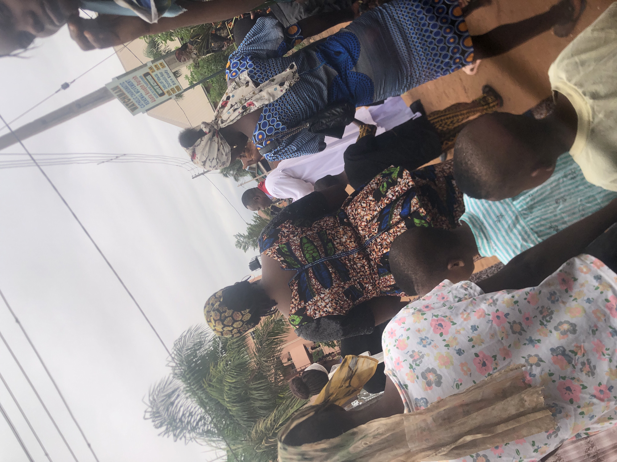 gathering of people in Nsugbe, Nigeria, near the Abata Nsugbe Parish of the Watchman Catholic Charismatic Renewal Movement. People are seen wearing a variety of colorful traditional clothing. A sign for the church is visible, listing Charismatic Hour and Bible Study as activities. There are trees and buildings nearby.