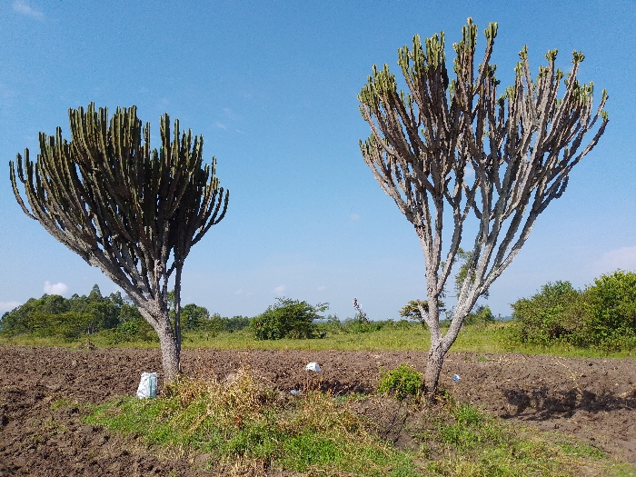 Two tall, unique trees dominate a freshly plowed field beneath a clear blue sky. The trees have multiple thick branches extending upwards, bearing green tips. The field is dark brown, with patches of green grass and vegetation. In the distance, a line of trees and shrubs stretches across the horizon, adding depth to the landscape. A few white objects are scattered around the base of the trees.