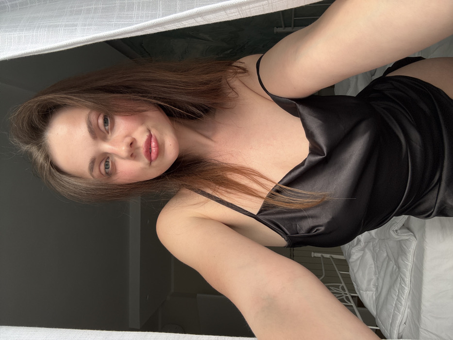 A female individual, approximately 20-30 years old, with light brown hair and light eyes, is depicted in a selfie, looking directly at the camera. She is wearing a black, satin-like slip dress. Her right arm is partially visible, extended towards the camera, while her left arm is mostly out of frame. The background on the left side of the image reveals a white metal bed frame with white bedding, and a dark grey wall with white ceiling trim. On the right, a white translucent curtain is partially visible, suggesting a window, with a darker, possibly textured, wall behind it. Natural light illuminates the scene. The location is an indoor setting in Scafati, Italy.