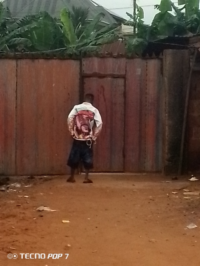 A person stands facing a closed, reddish-brown metal gate with a smaller door within it. The person wears a light-colored shirt with a large graphic on the back, dark shorts, and sandals. A backpack is also visible. The ground is dirt with scattered debris. Above the gate, banana trees grow. A house roof can be seen. The photo appears to be taken in a residential area. A "Tecno Pop 7" watermark is visible.