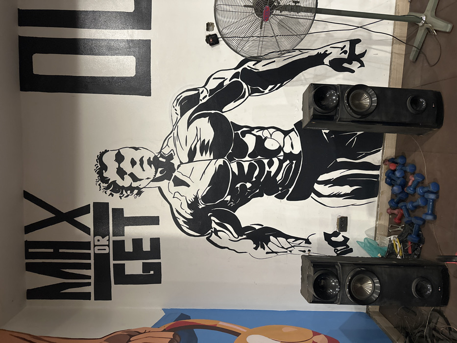 gym wall with a black and white mural of a muscular man