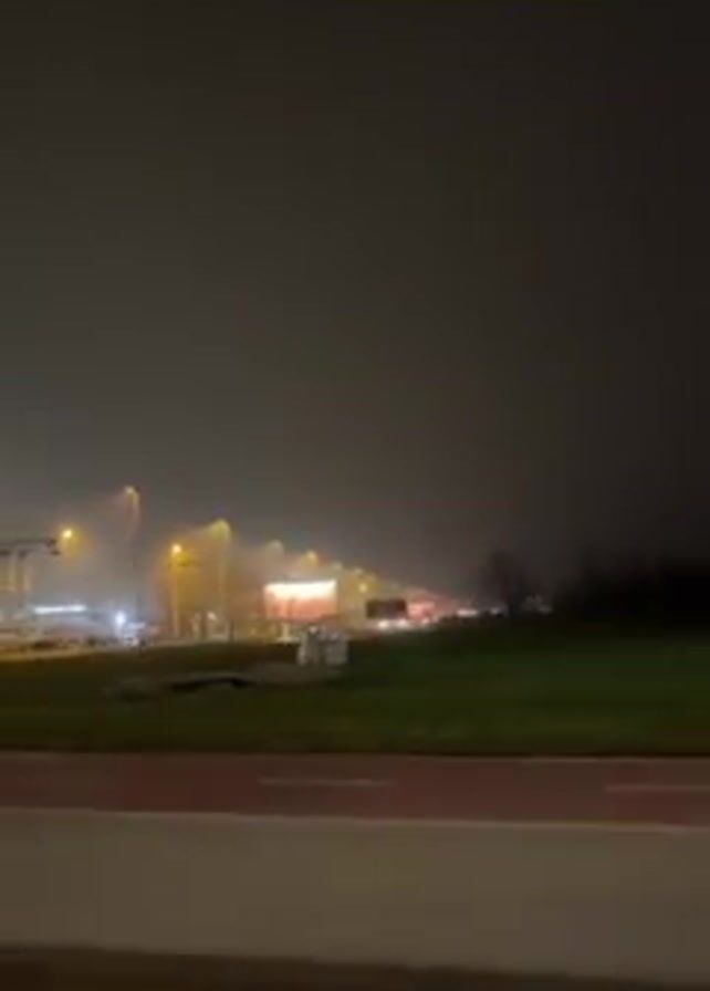 nighttime shot from inside a moving vehicle driving on a road. The road is illuminated by yellow streetlights, which appear to cast light through fog or mist, creating a hazy atmosphere. There are crosswalk markings on the road. There is a grassy area to the side of the road, with buildings and illuminated billboards visible in the distance. A sign with a blue circle and white arrow is visible on the right side of the road. A few vehicles can be seen on the road, their headlights illuminating the way. The video captures the scene of a foggy night in an urban or suburban area.