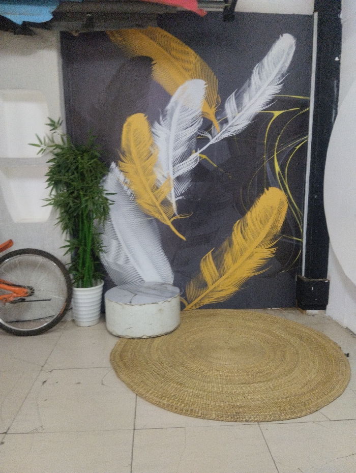 A room features a neutral-toned tiled floor, upon which sits a circular, woven jute rug. A cylindrical ottoman with a weathered white surface is near the rug. Behind the ottoman stands a potted green plant. A bicycle wheel is partially visible to the left of the plant. The backdrop is a dark gray canvas adorned with stylized yellow and white feather designs. The composition is completed with a black frame element on the right side of the canvas.