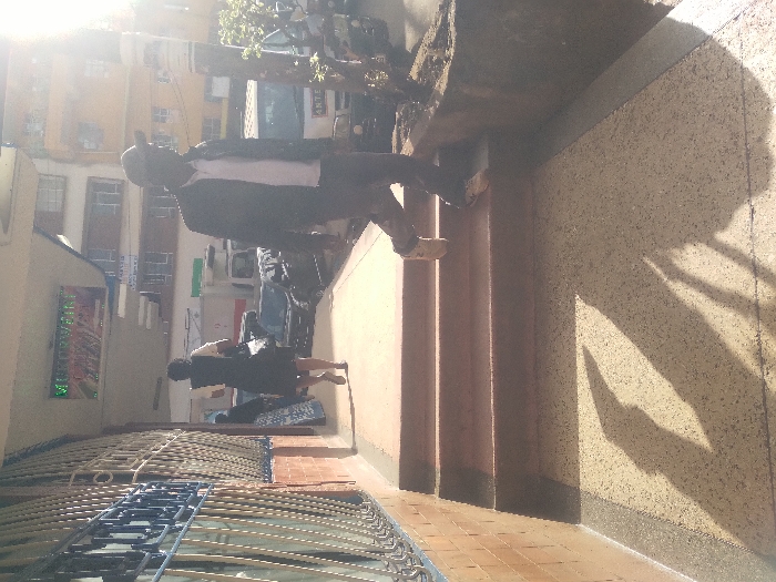 An aerial shot captures people walking on a balcony in an urban setting. A man in a dark suit and white shirt leads a woman in a short black dress and white socks. A wrought-iron railing frames the scene, providing a view of the buildings across the street. Sunlight casts sharp shadows onto a textured wall, creating a pattern of light and dark. A small tree and parked scooters are visible on a building across the street.