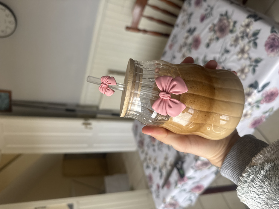A close-up photograph depicts a human hand holding a clear glass beverage bottle in an indoor setting, identified as the city of Armagh, United Kingdom. The bottle, which has a ribbed design and a slight indentation in its midsection, is topped with a light-colored wooden lid. A clear glass straw emerges from the lid, adorned with a small pink bow. A larger pink bow of the same style is affixed to the front of the bottle. The bottle contains a layered beverage: an upper stratum of dense, light brown foam or whipped topping, and a lower stratum of lighter, milky brown liquid. The hand grasping the bottle is visible from the fingers to the wrist, where a portion of a grey, textured long-sleeved garment is visible. In the background, a table covered with a white tablecloth featuring a pattern of pink roses and green leaves is visible. A pair of black and green scissors lies on the tablecloth to the left. To the right, part of a wooden chair with a slatted backrest is present. The far background reveals light-colored walls with two white paneled doors; one is partially ajar, offering a glimpse into another room with an angled ceiling and light-colored walls. A round wall clock with a white face and black markings is partially visible on the upper right wall, and a framed object hangs higher on the left wall.