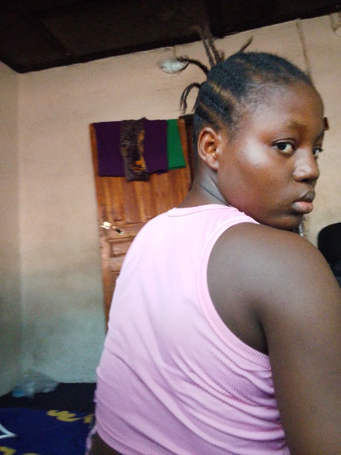 The image depicts a dark-skinned individual, appearing female, within an indoor room in Alaiyabiagba, Nigeria. The subject is shown from the mid-back and right shoulder, wearing a light pink, ribbed sleeveless top. Their black hair is styled in cornrows on the sides, with some sections gathered into upward-protruding bunches at the crown. The individual's head is turned sharply to their right, directing their gaze over their right shoulder towards the camera. The background consists of light beige-colored walls and a dark brown planked ceiling. A wooden door, complete with a metallic handle, is visible behind the subject. Draped over the upper portion of the door are three pieces of fabric: one purple, one green, and a dark patterned textile. A wall-mounted light fixture with a white bulb is affixed to the upper-left wall. In the lower-left foreground, a dark blue fabric with yellow patterns is partially visible.