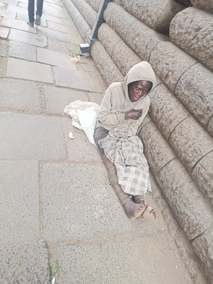 A person sits on a stone sidewalk, leaning against a textured wall. They wear a hooded sweatshirt and a patterned cloth covering their legs. Their bare feet are visible on the pavement. The person's expression suggests discomfort or coldness, with hands clasped to their chest. Another person's legs are visible walking in the background. A small amount of litter is visible on the pavement.