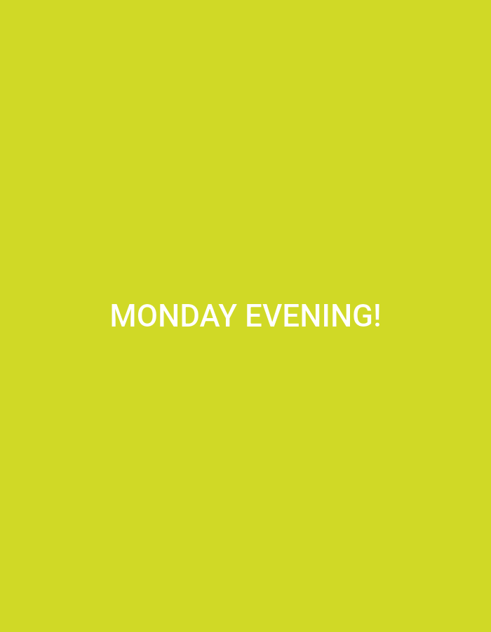A solid chartreuse background features the white text "MONDAY EVENING!" in a centered position