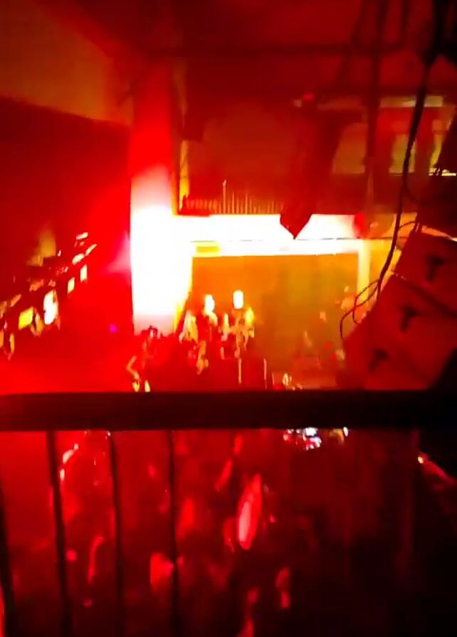very dark environment, likely a nightclub or concert venue, illuminated primarily by red lighting. The camera is positioned behind a railing, suggesting an elevated view of the crowd. The red lights are dynamic, shifting and pulsing, with some beams visible. The crowd appears as silhouettes, moving and potentially dancing to music, though the sound is muffled or nonexistent. There are visible sound system components, likely speakers, hanging above the crowd. The overall atmosphere is intense and energetic, typical of a nightlife setting.
