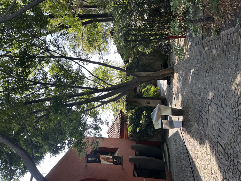 A tree's leafy branches extend across the upper left portion, partially obscuring the sky. Below, a red building with a "Lazcarro" sign adjoins a stone-paved path leading into the frame. A metal structure sits on the path, casting shadows. Further along, green shrubbery grows on a wall, where a bicycle leans against it. The scene is outdoors with a mix of sunlight and shade.