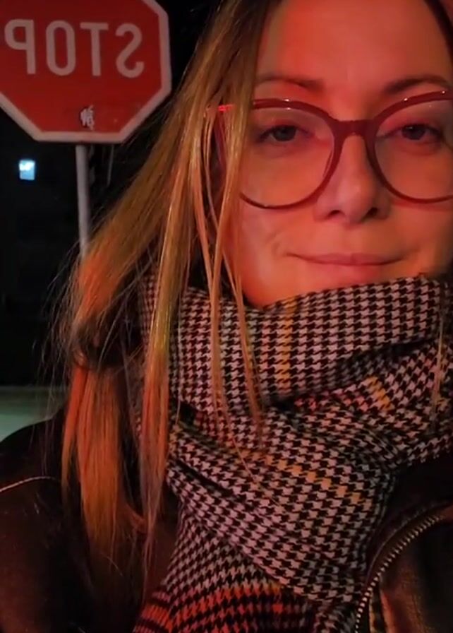 A woman with glasses and a scarf is in front of a stop sign that is reversed. She is wearing a leather jacket. The lighting appears to be red. It is nighttime.