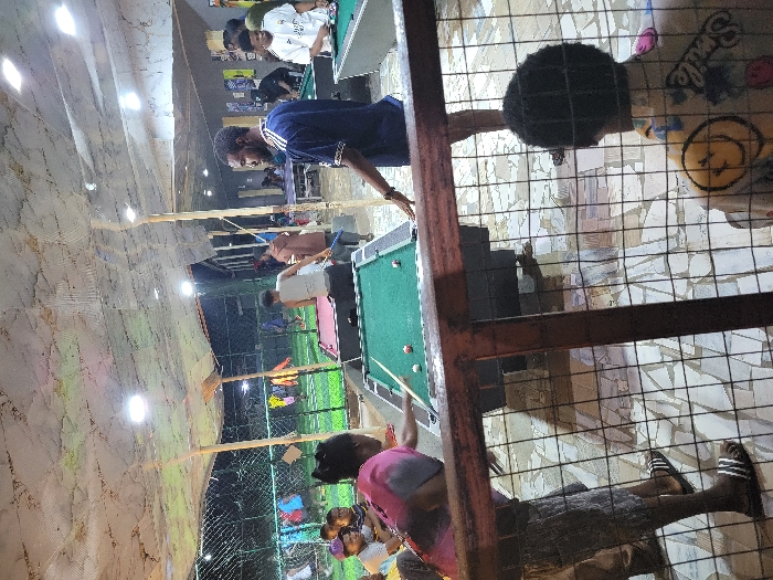 A busy indoor recreation area features multiple pool tables where people are engaged in games. One individual in a blue striped shirt is actively playing, while others are either watching or waiting their turn. The space is lit by bright overhead lights and a wire mesh fence adds a layer of enclosure. Children are visible in the background, and the area suggests an informal, community-oriented hangout spot.